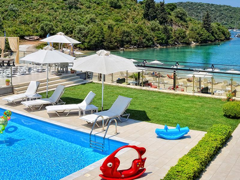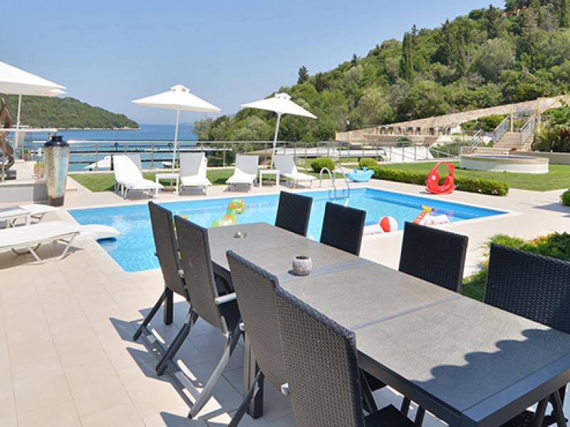 Karvouno Villas is 5 star Luxury Complex constructed in stone by expert craftsmen and has just 3 villas in total in a large plot enabling plenty of privacy between each villa .   Two large villas are able to accommodate  up to 7-10 people and a smaller villa which sleeps 4-5 guests. Each villa has it’s own pool and extensive external area of gardens, external dining and lounge areas all with magical sea views.   Sivota is famous for it’s wonderful sunsets which can be enjoyed relaxing by pool from each villa.  The complex is built just 50 metres from the beach in a quiet green cove but conveniently just 600 metres from the picturesque harbour of Sivota.